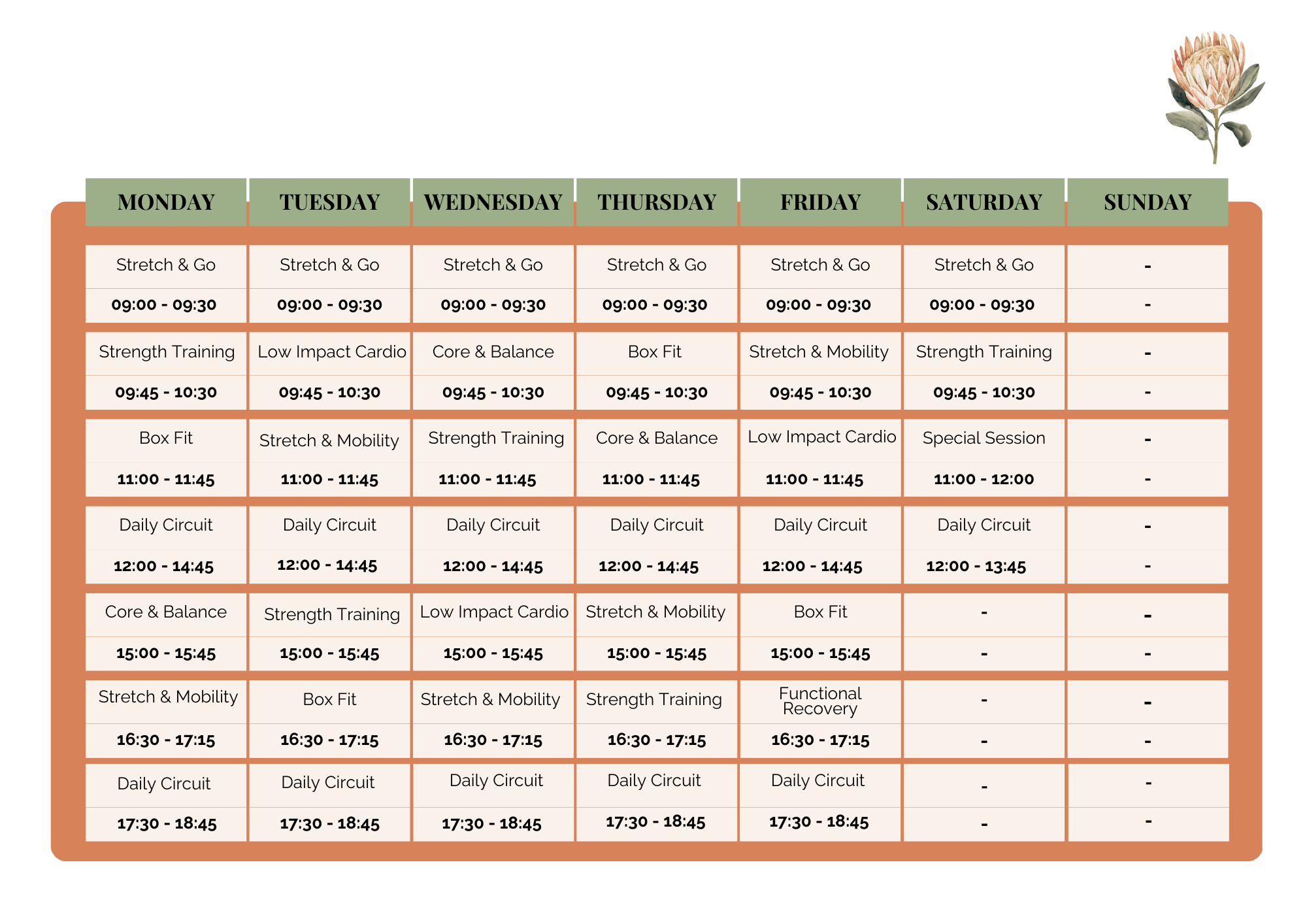 Special Sessions: Reserved for special sessions and community events, such as themed classes, partner circuits, sweat‑and‑stretch combos, and wellness workshops.